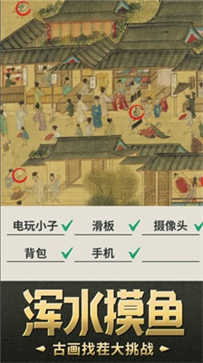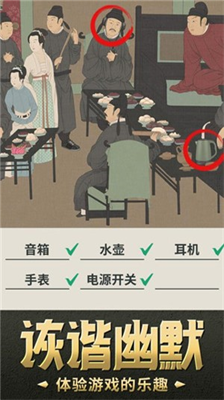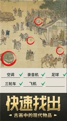 1、玩家需要在古画中快速识别出那些格格不入的现代物品,一旦成功找出就能通关。规则简单明了,适合所有年龄段,上手轻松无压力。