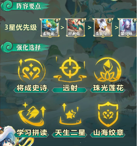 羁绊设计是阵容成功的关键,5山海绘卷羁绊提升全体英雄的法术强度与生存力,2天将增强团队移动和攻击速度,2幽魂提供额外法术穿透效果,2护卫增加前排护甲,2擎天卫强化控制能力,2法师提升技能伤害,2狙神优化后排输出精准度,2神谕则加快法力回复。这些羁绊相互叠加,形成高爆发输出链,让阵容在中期至后期阶段发挥最大威力,轻松应对密集战斗。