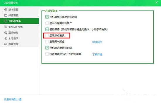在360设置中心内,切换到“开机小助手”选项卡,右侧窗口会列出多项功能选项。请取消勾选“显示焦点”项,同时建议一并禁用其他无关功能如“显示不定期开机推广”,以减少系统启动时的额外负担。这一步不仅针对热点关闭,还能优化整体性能,让电脑运行更顺畅。