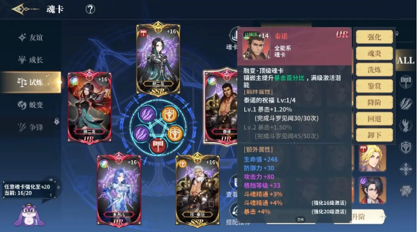 6、平民玩家破局重在精准投资。魂卡洗练与套装成型需巨额投入,建议优先选择试炼或争锋套装聚焦暴击爆伤路线。红卡培养遵循"单卡突破"原则:集中资源将核心输出魂师的魂卡升至红阶并洗练出攻击向属性,其余位置维持金卡+16状态。防御系魂师可长期使用成长套装金卡,最大化利用有限资源。