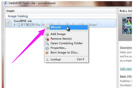 在DAEMON Tools的上部区域,您会看到一个镜像文件列表,其中列出了所有已加载的文件。找到您刚刚添加的mds文件条目,用鼠标右键单击它。在弹出的菜单中,选择“Mount”选项,这代表挂载操作。挂载过程类似于将虚拟光盘插入虚拟光驱,软件会开始处理文件内容。如果软件尚未激活或处于试用模式,系统可能会弹出注册提示窗口。此时,您可以选择点击“退出”或“忽略”按钮继续操作,无需立即购买,试用版通常支持基本功能。