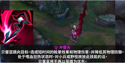 Q技能-冲昏头:兼具突进与破甲的多功能技。跳跃造成伤害的同时削减目标20%护甲持续4秒,配合被动流血效果显著提升后续伤害。在嗜血状态下释放时,会优先攻击最近单位而非英雄,清野时可利用此特性保持血线健康。
