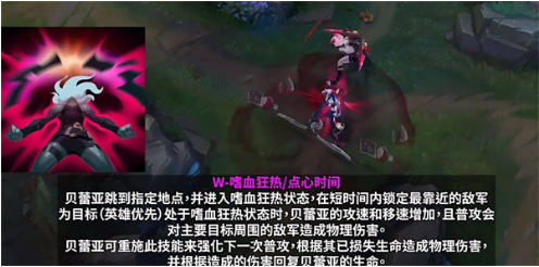 W技能-鲜血狂乱:核心状态切换技能。首次释放进入12秒嗜血模式,提升35%攻速和移速并自动锁定最近目标。二段激活强化下次普攻,基于已损失生命值造成额外伤害并回复生命。该技能冷却期间会陷入虚弱状态,需谨慎选择开启时机。