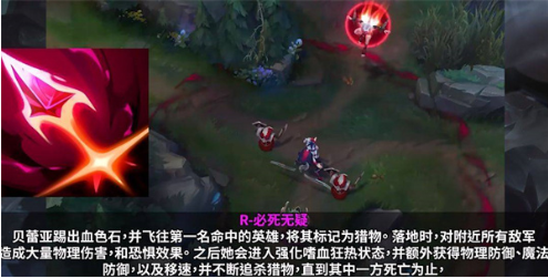 R技能-必死无疑:超远距离开团利器。血色石飞行距离随等级提升至2000码,命中后标记猎物并恐惧周围敌人。强化嗜血状态提供额外双抗与移速,期间免疫控制效果并持续追击直至目标死亡。该技能可穿越地形,但飞行轨迹能被敌方英雄阻挡。