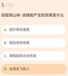 答案:D、击退击飞敌人。虎啸效果能强力击退并击飞附近敌人,创造输出空间。在狭窄地形或团队配合中,此技能可打断敌方连招,为队友提供支援,实战价值极高。