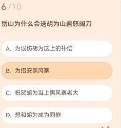 答案:B、为招安黑风寨。岳山赠送武器的目的是招安黑风寨势力,这一情节体现了游戏中的联盟策略。胡为作为关键人物,山君怒阔刀增强了他的战力,推动剧情发展。