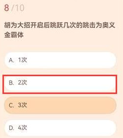 答案:B、2次。胡为开启大招后,第二次跳跃攻击触发金霸体状态,提供无敌帧。玩家需掌握跳跃节奏,在PVP中规避伤害并反击对手。